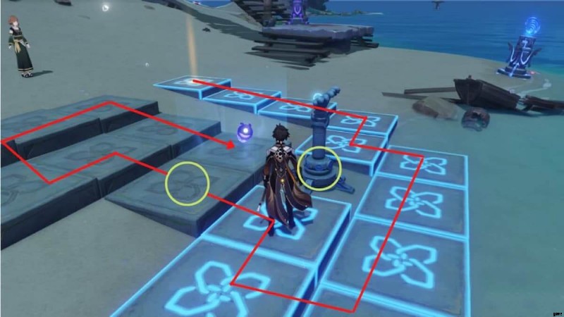 そうすることで、ワタツミ像のロックが解除されます。 近くの光に反応する前に像に祈りをささげましょう .その後、光るタイルパズルが登場。このルートに従ってパズルを完成させてください: