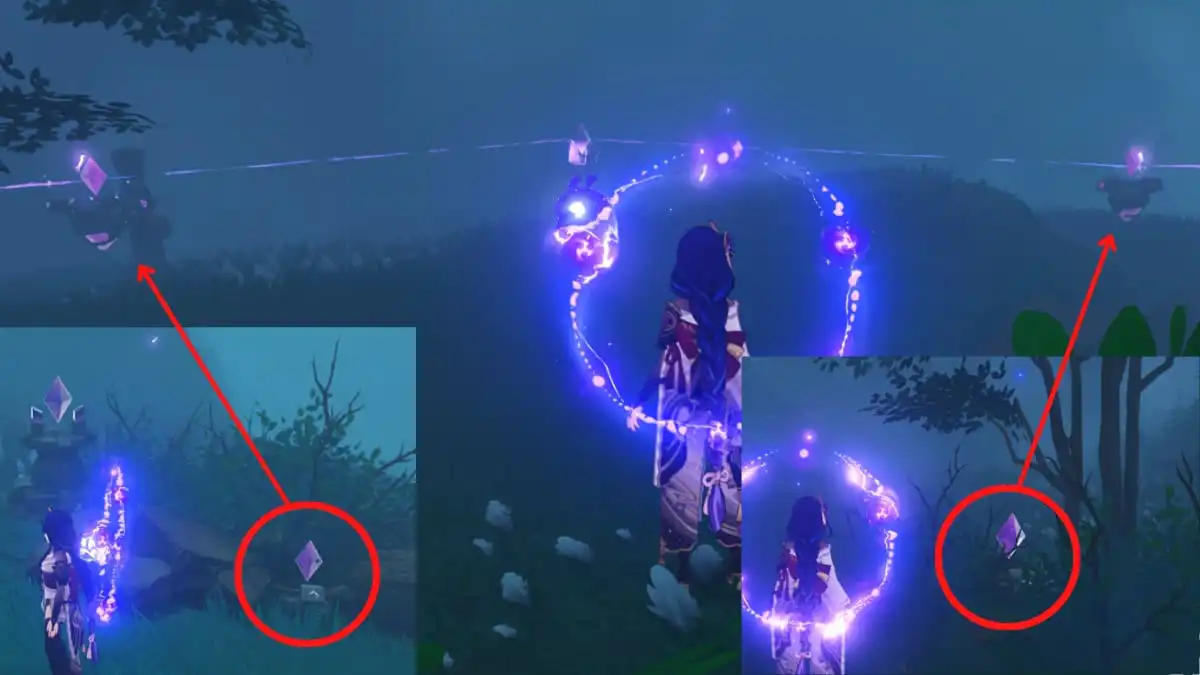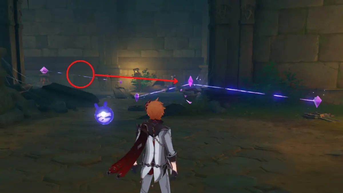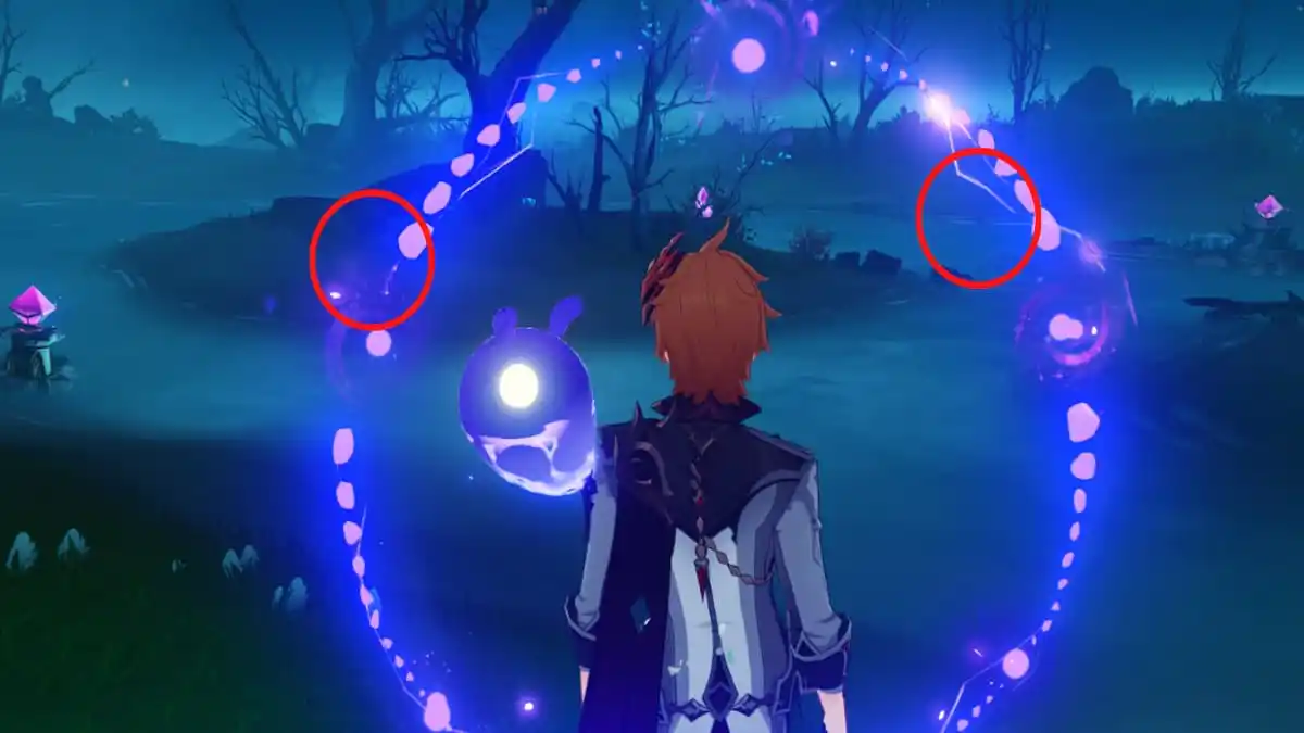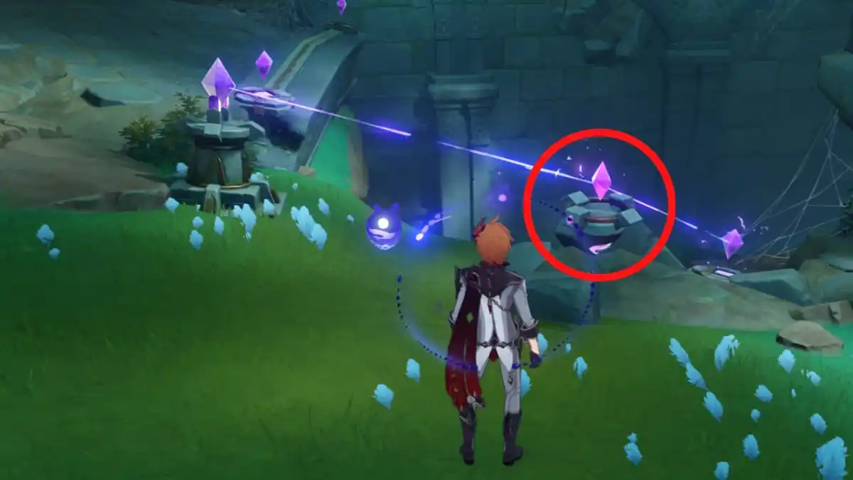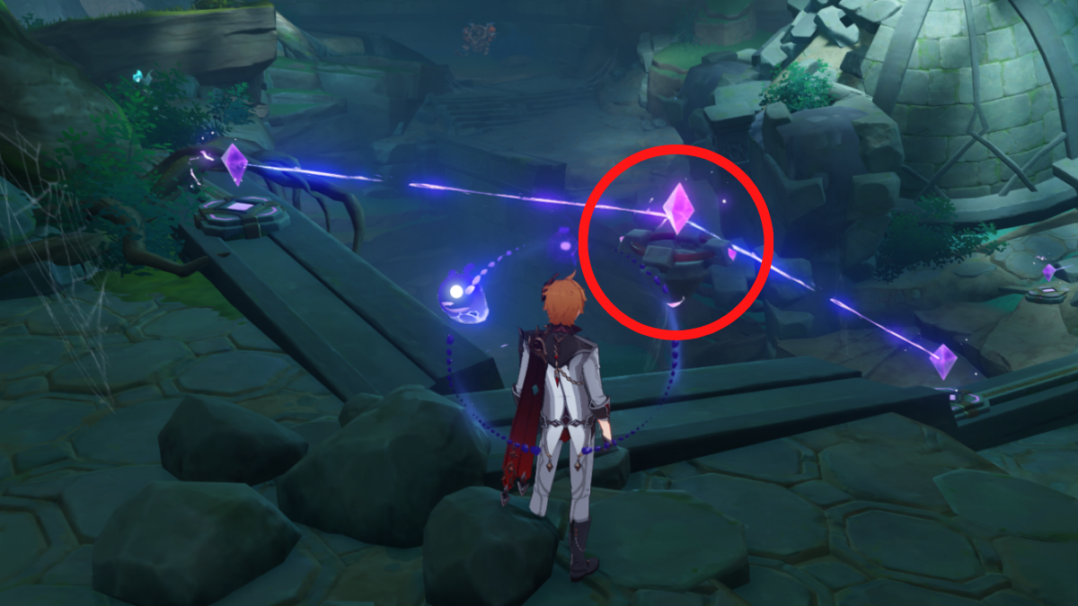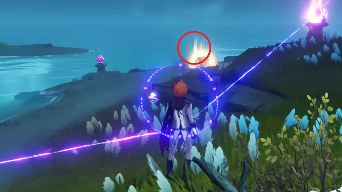 2 番目の部分は少し難しいので、正しく理解するには何度も試行する必要があるかもしれません。近くにエレクトロ シーリーがいます。チェストに飛ぶ代わりに、それはあなたのリードに従い、エレクトロカレントを作成するのに役立ちます.上の画像の草むらの場所にキャラクターを連れて行くと、シーリーは赤でマークされたエリアに飛んでいきます。これにより、すべてのストーンが接続され、パズルが完成します。