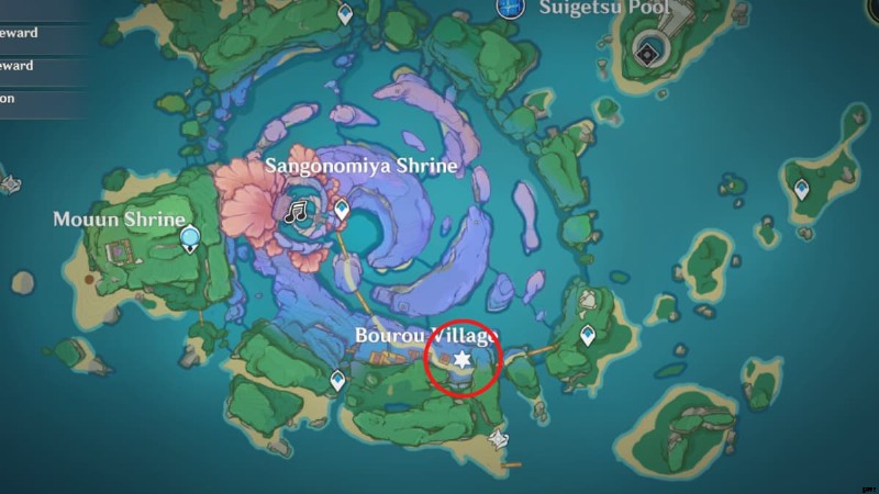 深海の神聖な植物 は、クエスト メニューに自動的に表示されないワールド クエストです。まずボロウ村に向かいます 小牧に話しかける。彼女の正確な位置は下の地図に示されています。