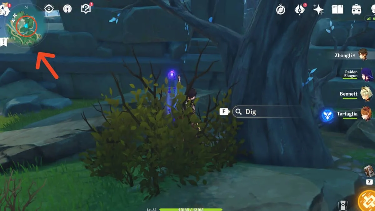 知来神社でレロの妻の墓を探してください。正確な場所は上の画像に示されています。 Dig インタラクションが表示されます 廃墟の横にある大きな木の下。 Thunderhelm Lawachurl を促すためにそれと対話します。 産卵する。