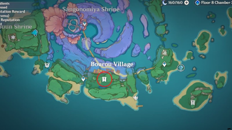 まず、Borou Village に向かいます。正確なエリアは、上の画像で丸で囲まれています。そこで岩田に会えます 、リトウのシュメール商人が販売しているものに似た肥料を作る計画について話してくれます。彼は、彼が作った肥料のバッチをチェックするためにあなたの好意を求めます.