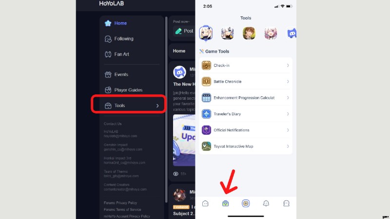 Enhancement Progression Calculator を使用するには、まず公式 Web サイトから HoYoLAB にログインするか、App Store または Google Play ストアからアプリを無料でダウンロードする必要があります。ウェブサイトの左隅またはアプリの下部にある [ツール] セクションを選択して、Enhancement Progression Calculator を見つけます。