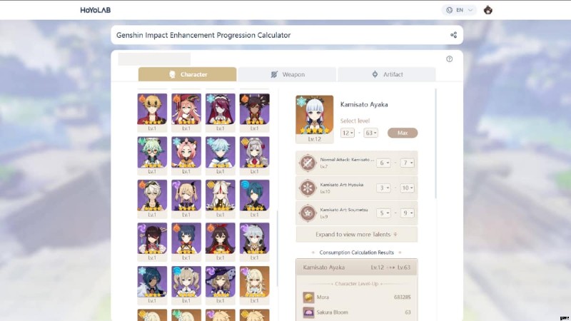HoYoLAB は、原神インパクトを含む miHoYo のすべてのゲームのコミュニティとツールを含む Web サイト/アプリです。増え続けるツールの中には、キャラクター、武器、タレント、アーティファクトの便利なアップグレード ファーミング ガイドである Enhancement Progression Calculator があります。