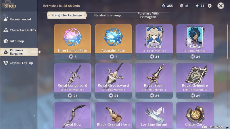 スターグリッター プレーヤーにリピートが与えられるたびに授与されます 4 または 5 つ星 武器やキャラクター。報酬の金額が異なります。 コンステレーションが不完全な4つ星のキャラクター スターグリッター 2 つと星 5 つに報酬 10 を与えます。星座が完成すると、報酬はそれぞれ 5 と 25 に変わります。武器の場合、改良に関係なく、報酬は 2 と 10 です。