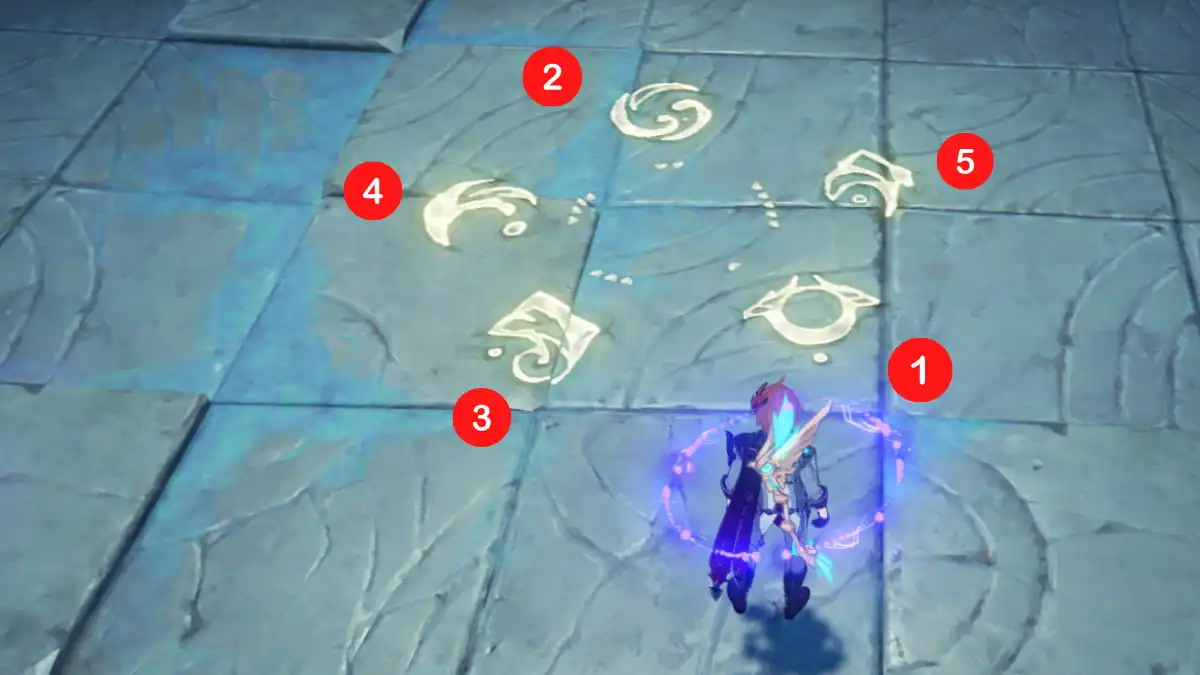 各シンボルは、透明な壁をアクティブにする順序を示す多数のドットとペアになっています。あなたがする必要があるのは、地面のシンボルと同じ順序で透明な壁を通り過ぎることです(祭壇の内側から外側に向かって)。