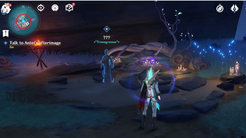 下の画像でマークされた場所に向かうことで、このワールド クエストを開始します。昼光設定が Evernight に設定されていることを確認してください .近くのテレポートウェイポイントに向かい、容疑者としてラベル付けされた2つの残像がある小さな空き地が見つかるまでジャンプします.