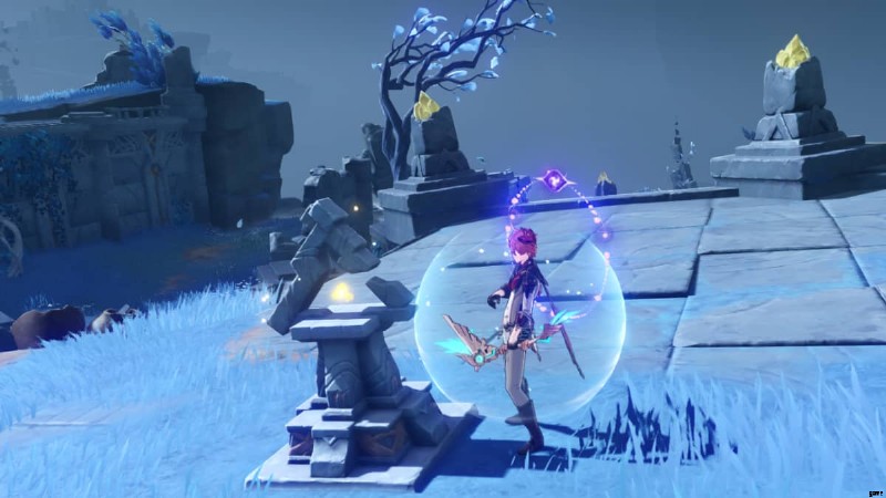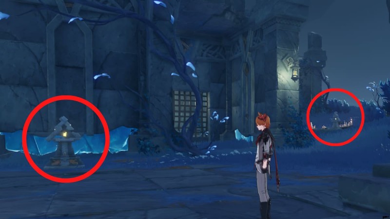 Amazonで原神インパクトを見るこの領域には 2 つのメカニズムがあります。遺跡の手前を先に攻撃し、次に右側を攻撃。これにより、ゴールデン ブライドルを含むチェストへと続く道が開かれます。
