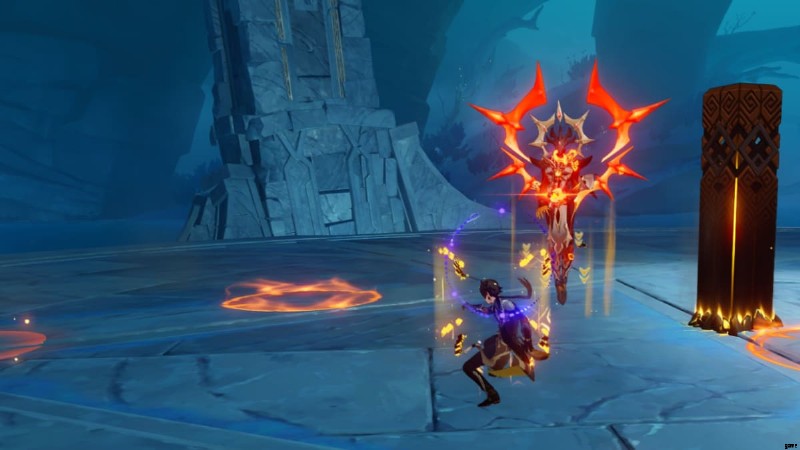 Vishaps が排除された後、Enjou が表示されますが、彼自身が Abyss Order のメンバーである Pyro Abyss Herald であることを明らかにするだけです。最初のフェーズでは、どのエレメントでもヘラルドを攻撃できます。しかし、HP が十分に少なくなると、強力な パイロ シールド を装備します。 エレメンタルリアクションでのみ中和することができます—気化(ハイドロを使用)が最強です。