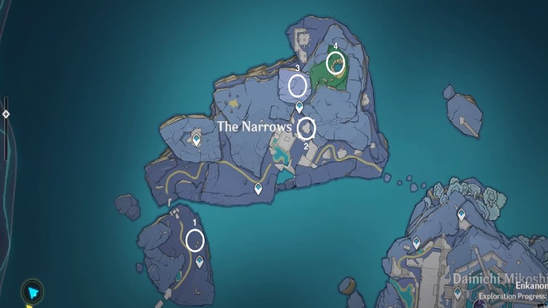 プレシャス チェストは全部で 3 つあります そして豪華な宝箱1つ The Narrows周辺で見つけることができます。チェストの場所は下の地図に示されています: