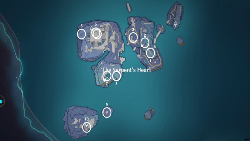 プレシャス チェストは合計 6 つあります 豪華な宝箱 4 つ それは蛇の心臓の周りにあります。チェストの場所は下の地図に示されています: