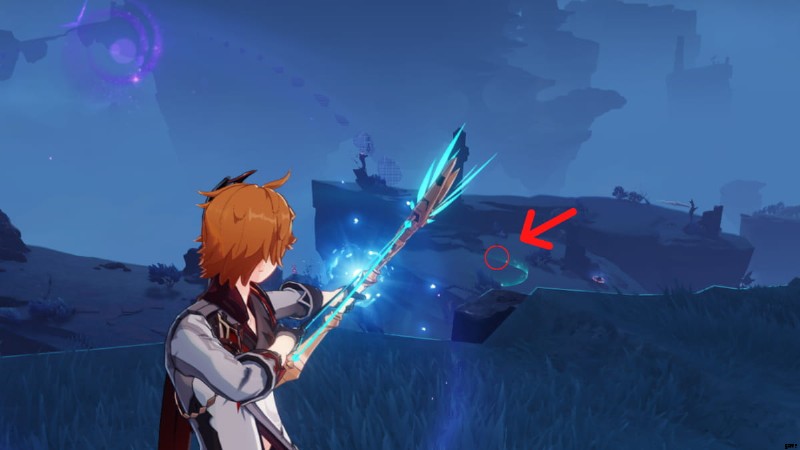 アーチャーに切り替えて、バリアを目指します。放った矢は空中のある地点に到達すると軌道が落ちてしまうため、地面にぶつかってもどこにも行きません。そのため、空中で狙うのが最適です 、上記の円でマークされた領域の周り。これにより、矢が強制的に地面に落ち、アーチェリー チャレンジが完了します。