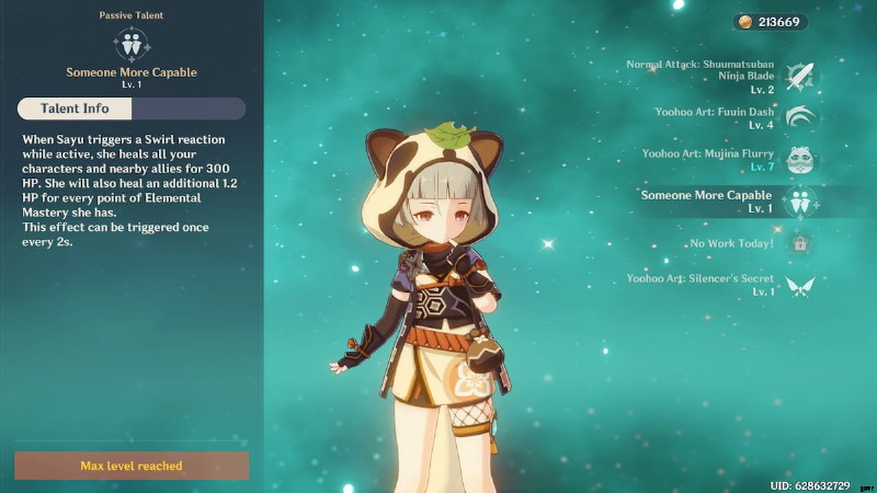 - もっと有能な人 - このパッシブは、Elemental Mastery が Sayu のすべてをカバーするもう 1 つの理由です。これで、さゆが Swirl をトリガーするたびに フィールドにいる間にリアクションすると、彼女はすべてのキャラクターと味方を 300 HP 回復し、エレメンタル マスタリーのポイントごとに追加で 1.2 HP を回復します。レベル 90 のさゆは、96 エレメンタル マスタリーを取得します。 Elemental Mastery を Main Stat として持つ 3 つの Artifacts に加えて、これは 655.5 に達する可能性があります。彼女の武器からの追加の Elemental Mastery、または Flower と Plume の Substats は含まれていません。これは、786.6 にベース 300 を加えたもので、Swirl がトリガーされるたびに合計 1086.6 HP になります。
