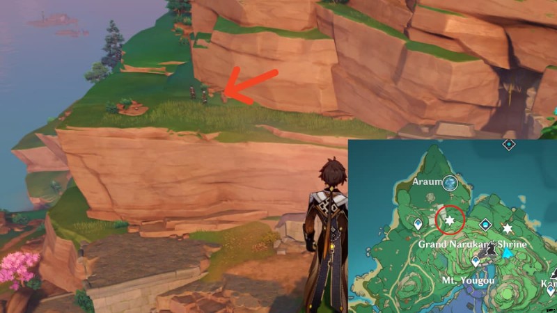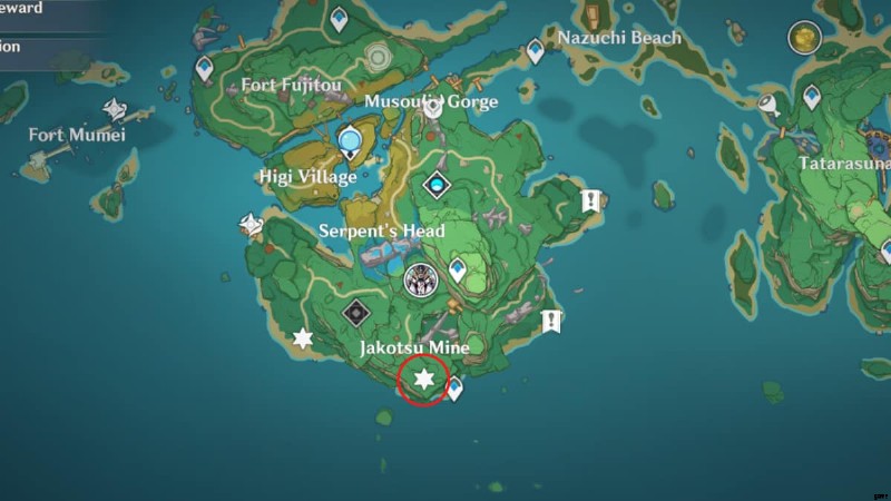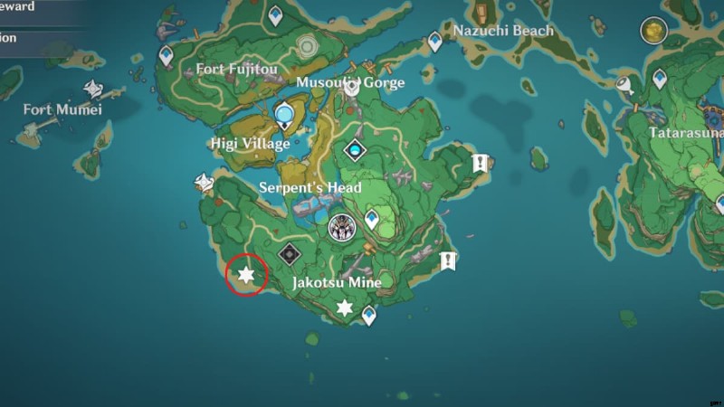 上の画像の丸で囲んだ場所に向かいます。天守閣の下の洞窟にあるので、海岸線に飛び降りてそこからエリアにアクセスしてください.火刃モリスと呼ばれる敵と、はぐれたカイラギを倒す。