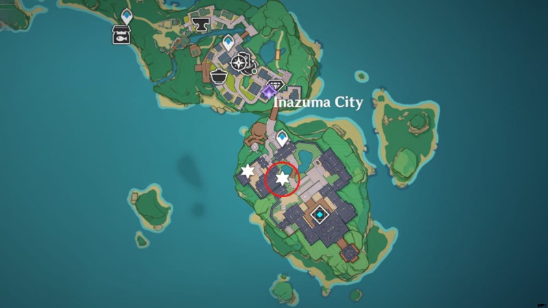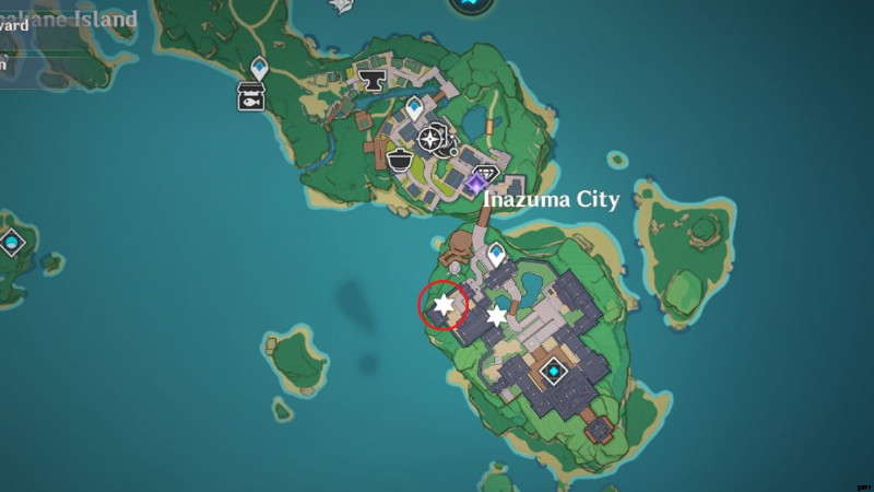ゲーム内時間を 00:00 から 06:00 の間の任意の時間に変更し、上の画像で丸で囲んだエリアに向かいます。初日と同様に、イナズマシティの下の海岸線に降りて、そこからマークアップされた場所にアクセスする必要があります.ノリシを倒す:きこうばんと 3 人の与力侍を倒すと、この日の目的を達成できます。