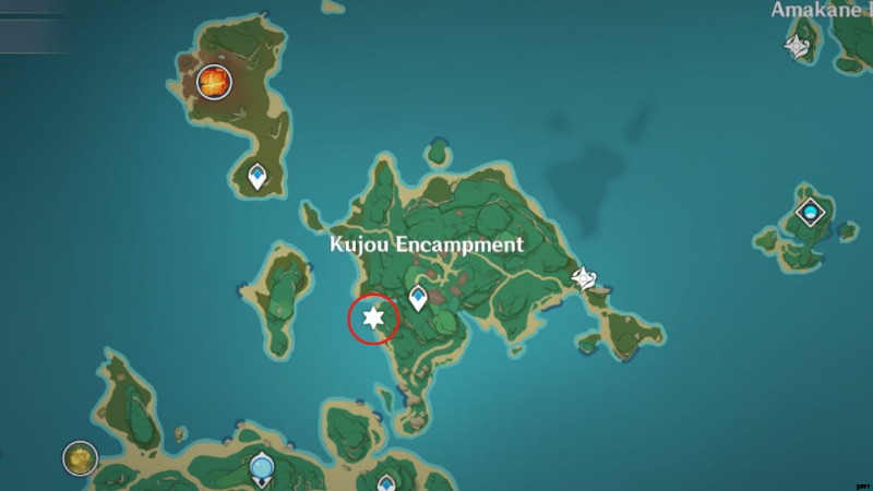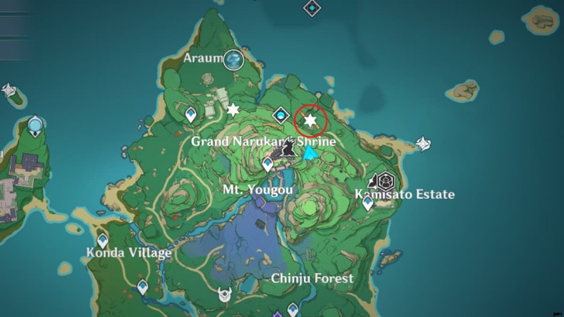 鳴神大社の北東にある壊れた橋に向かいます。その正確な位置は、上の画像で丸で囲まれています。光る調査スポットが見つかります。近づくと気絶してしまう。