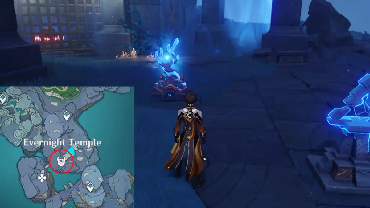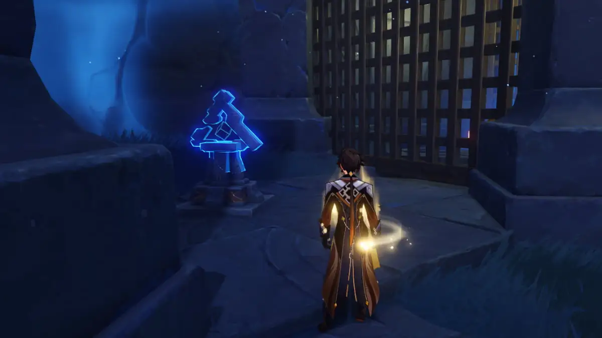 Amazonで原神インパクトを見るEvernightの期間中、下の画像で丸で囲まれたエリアに向かうことから始めます .貴重なチェストを収容する鍵のかかったゲートと、立ち入りを禁止するバリアを備えた半分破壊された建物が表示されます。