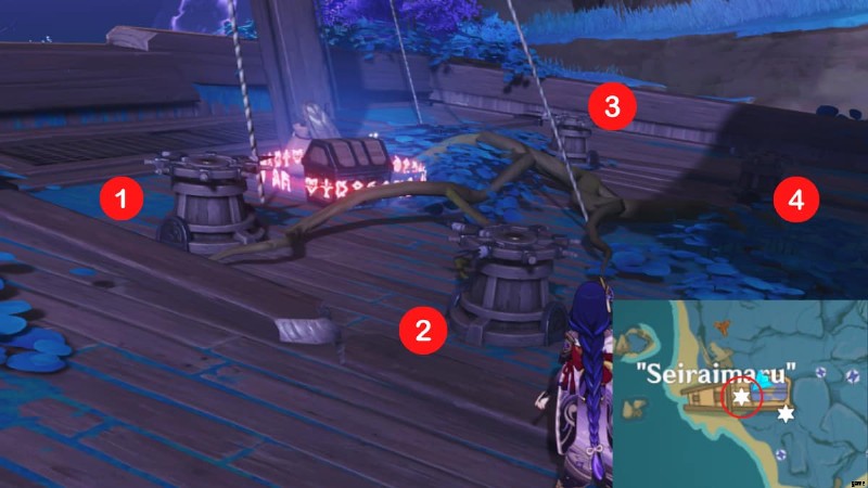 誤って反時計回りに何度も回転させてしまった場合は、時計回りに回転させて逆回転させます。 4つすべて完了すると、船「星雷丸」の入り口のカットシーンが再生されます。