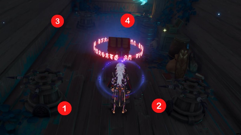 「星雷丸」の難破船の中では、船内の鍵のかかった部屋を開くことを含む 2 つの部分からなるパズルにつながるシーリーに遭遇します。近くにあるメモリー タイル パズルを完成させることから始めるか、前者と組み合わせてこのパズルに取り組んでください。