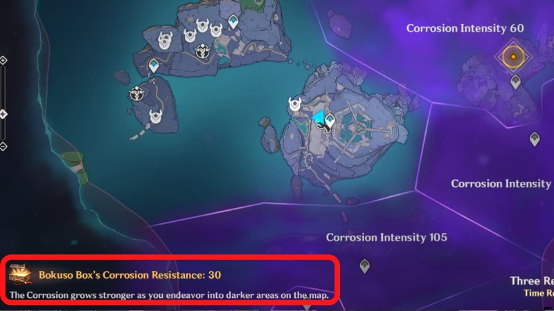 腐食強度は、エリア内の暗さのレベルです。これらの値はワールド マップで確認できます。ワールド マップは、アクセスが困難な場所の強度を示しています。耐性よりもはるかに高い腐食強度のエリアに入ると、ボクソー ボックスの光は闇を持ち上げることができなくなります 敵、オブジェクトなどから。その光も中程度から速いペースで減少します 、腐食の不一致の大きさに応じて。