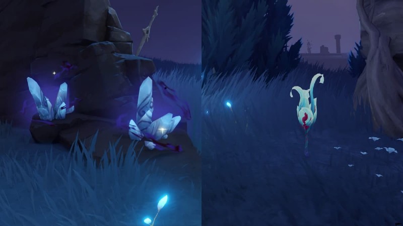 エンカノミヤ周辺で発見されたアフォティウム鉱石は、濃い闇に包まれています 、そしてそれを集めるためには、まず牧草箱の力を使ってそれを浄化する必要があります.この世のものとは思えない幻のトコヨマメは、牧草箱を装備しない限り収集できません 、その時点でそれらは具体的になり、他の植物と同じように拾うことができます.
