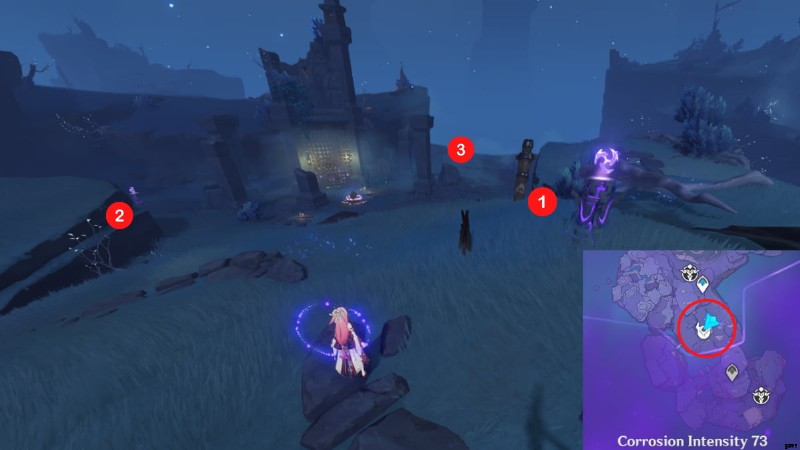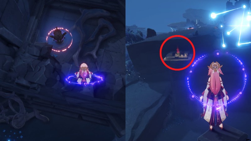 - 最初のエレクトロ モニュメント :崖の上のヒリチュルを倒してロックを解除し、エレクトロ アタックでアクティブにします。 絶妙な宝箱があります ボクソーボックスで浄化した後に受け取ることができるモニュメントの横。