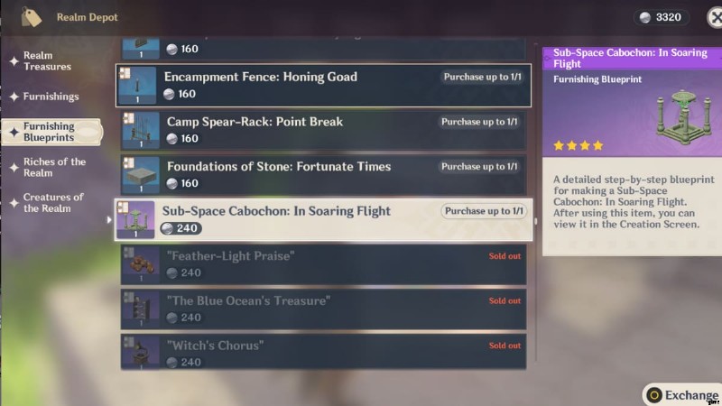 気の利いたエレベーターを手に入れるには、Serenitea Pot の Tubby に話しかけ、Realm Depot を選択します。左側のパネルにある調度品の設計図セクションに移動し、サブスペース カボション:In Soaring Flight が見つかるまで下にスクロールします。 . 240 レルム通貨で購入 .