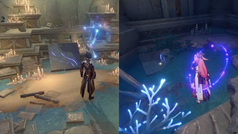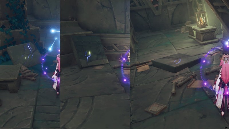大日神輿の東、上の画像の丸で囲んだエリアに向かいます。地下に 2 つの破損したストーン スレートがあります。地下通路のロックを解除するには、2 つの導きの光の鏡のパズルを完成させる必要があります: