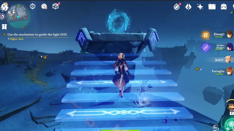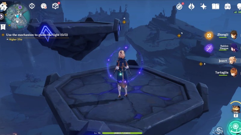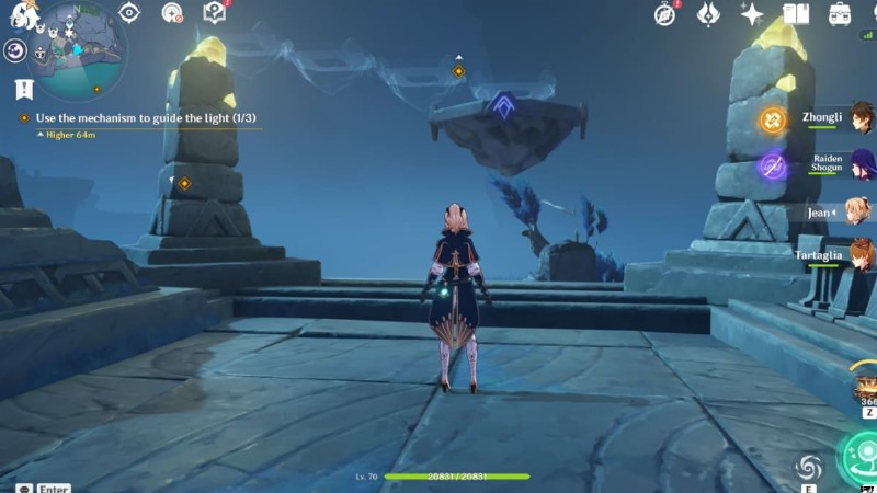 クエスト マーカーに従って、常夜の神殿があるはずの Three Realms Offering Gateway の東に進みます。次に、Anemo を適用します。 銅像の前にあるアネモ モニュメントまで行き、風流を発生させ、それに乗ってプラットフォームまで持ち上げます 空に浮かぶ。