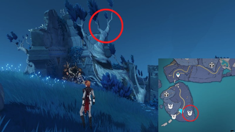上のエリア サークルに向かい、2 番目のシーリーを見つけます。このエリアはいくつかの Hilichurl と Thunderhelm Lawachurl に囲まれているので、注意して すぐに戦えるチーム を連れてきてください。 .シーリーはとげのある植物に閉じ込められています。パイロ攻撃を使用して植物を取り除き、前者を解放します。次に、シーリーをポストに戻してコモン ボックスを入手します。