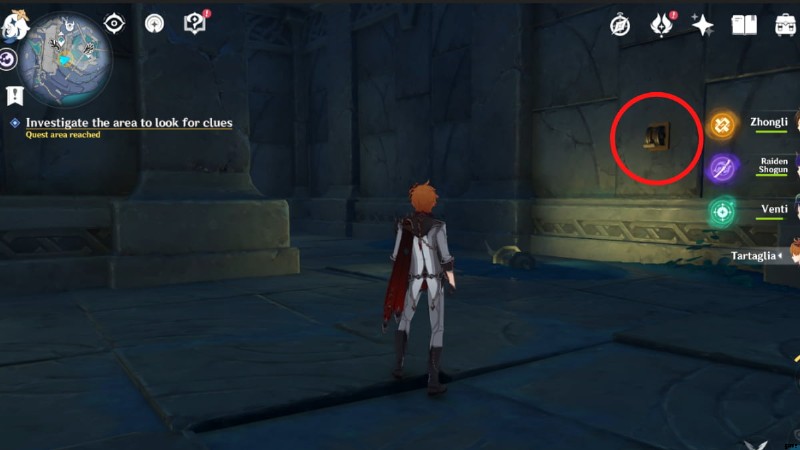 レバーを操作した後、部屋を出る クエストマーカーを上にたどります。ロックされたメカニズムとストーンスレートパズルを含む部屋への別の狭い入り口に遭遇します.パイモンとの会話の後、矢部に話しかけると、行方不明の破損した石板をすべて探すように求められます。