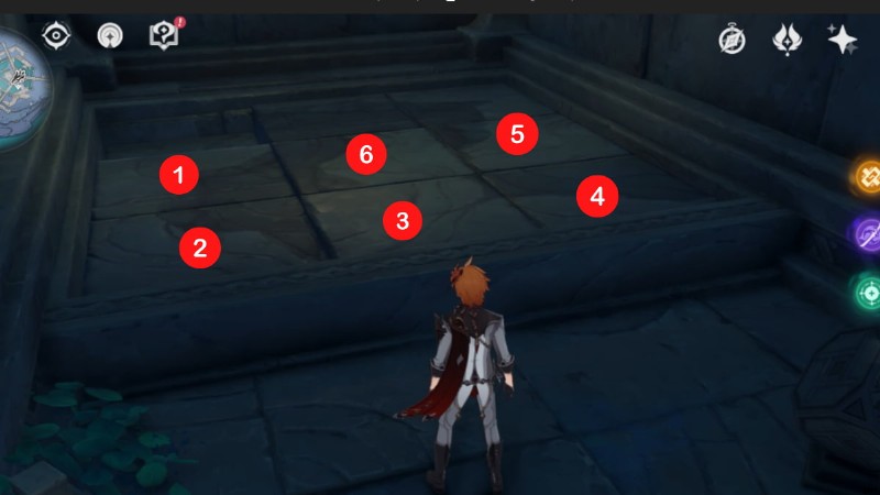 パズルを解くには、スレートを正確な順序で踏んで操作して動かします 上記のとおりです。中央が空の状態で、一貫したパターンが作成されます。間違えた場合は、近くのメカニズムを操作してパズルをリセットしてください。