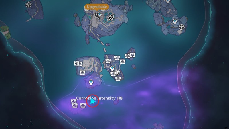 上の画像で丸で囲んだエリアに向かうことから始めます。北のテレポート ウェイポイントから滑空することで小島に到達できます。腐食強度は非常に高いです。このエリアを安全に移動するには、牧草ボックスを 11 までレベルアップする必要があります。