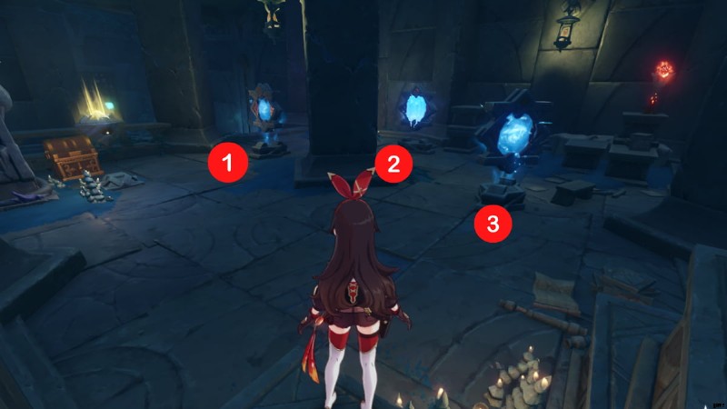 残りの 2 つのトーチは、ガイディング ライト ミラー パズルと同じプラットフォームにあります。それらを照らしてコモンチェストを入手してください。