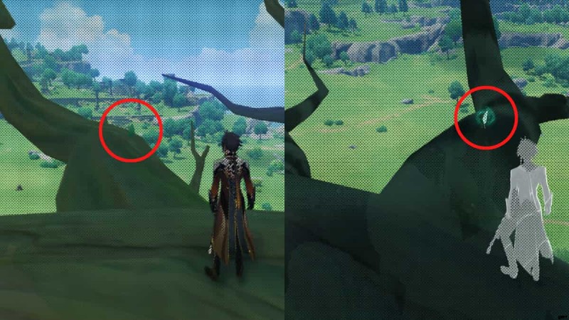 あなたの目標は、風の 3 つの痕跡を探すことです .巨木の枝にいるので、よじ登って浮葉を探しましょう。見つけにくいので、Elemental Sight を有効にしてください PC の場合はマウスの中ボタン、モバイルの場合は対応するアイコン、PlayStation の場合は L1 + 左方向パッド ボタンをクリックします。