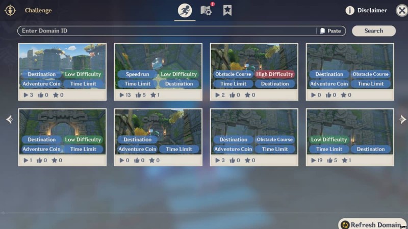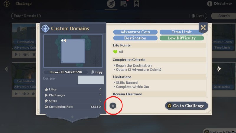イベント メニューの右下にある [カスタム ドメイン] ボタンをクリックすると、他のプレイヤーが作成したカスタム ドメインを完成させることができます。ランダムに選択するか、実行したい特定のコースのドメイン ID を入力することができます。