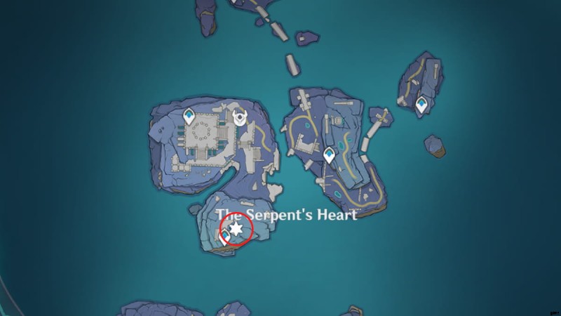 The Serpent's Heart の南にある Teleport Waypoint の北東に向かうことから始めます。下に飛び降りると、水とその上に浮かぶゴーストフィッシュの群れがある明るい空き地が見つかります。 Geo Construct、Wind Current を使用するか、近くの岩や背の高いキャラクターを使用してGhostfish に飛び込みます .