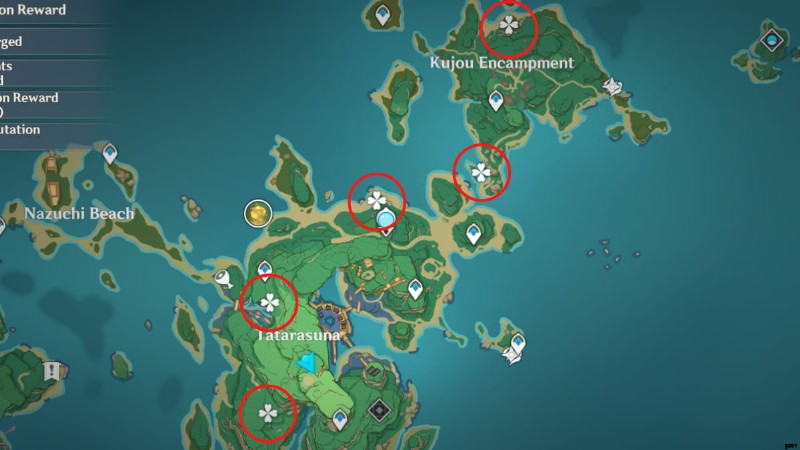 5つの雷桜は、下の画像の丸で囲ったところにあります。それらは任意の順序で訪問できます。