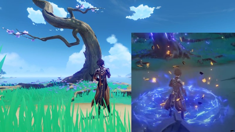 それぞれの雷桜の周りには約 3 つの青いオーラがあるので、Elemental Sight をオンにして目を離さないようにしてください。 3つすべてが雷に打たれた後、雷は消えます。 光る調査スポットとやり取りする 雷桜に乗って異物を拾う 、後でみゆきに戻す必要があります。