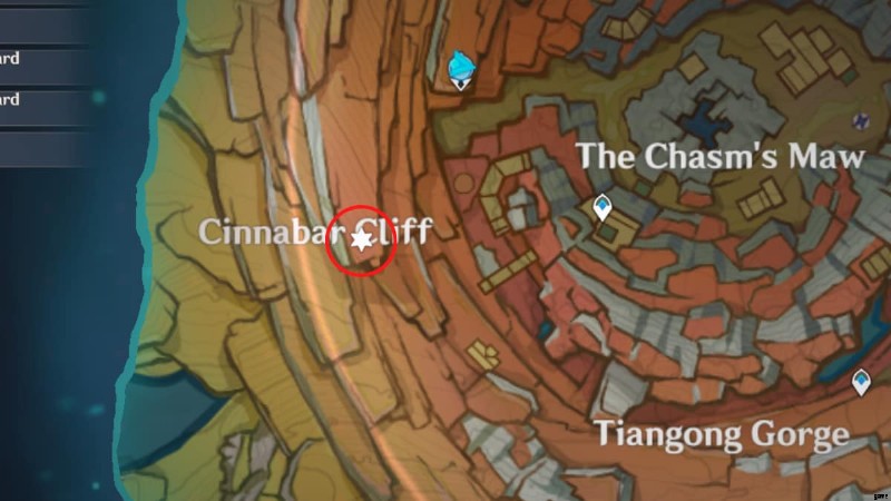 まず、下の画像で丸で囲んだエリアに向かいます。エリアに近づくと、ダイアログが表示されます。シナバー クリフには複数のレイヤーがあることに注意してください。このワールド クエストを見つけるには、最上部に到達する必要があります。
