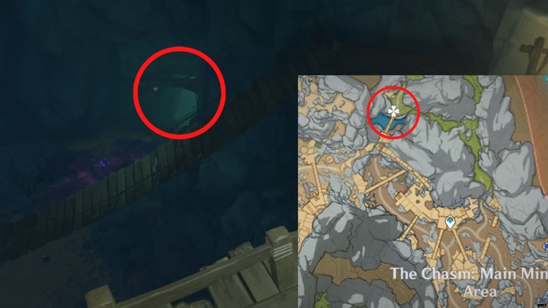 最初の写真の場所は、上の画像で丸で囲まれています。見つけにくい場合は、最初に The Chasm:Main Mining Area の北側にある Teleport Waypoint に移動します。次に北西を見ると、木製の橋の先に開口部があります。そこに向かい、光るスポットのある別の木製の橋を見つけてください。写真を撮るには、この橋と触れ合う必要があります。