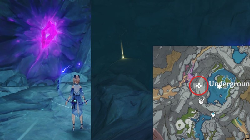 2 枚目の写真は、地下水路のわかりにくい場所にあります。まずはジオモニュメントのある開拓地へ。 The Chasm:Main Mining Area の南側の Teleport Waypoint に行き、左の小道をたどるとそこにたどり着くことができます。壁に奇妙な異常が見つかります。これはルーメンストーン アジュバントを有効にすることで解消できます。 .