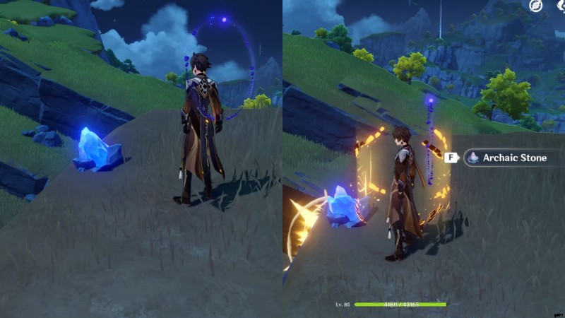 アルカイック ストーンは、地上のキャズムに現れる青く光る岩の中に保管されています。クレイモアまたはジオ ダメージでそれらを攻撃して、外殻を破壊し、内部のアルカイック ストーンを収集する必要があります。