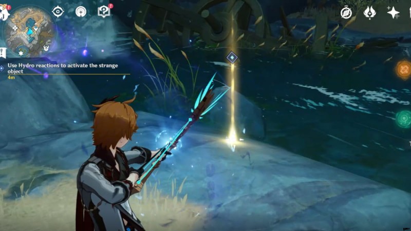 クエストマーカーに従って、戦闘準備が整ったチームと一緒に地底水路の北にある滝まで進みます。 交流 光る調査スポットで。その後、ハイドロを使用してストレンジ オブジェクトをアクティブにする必要があります。 ハイドロ アタックで光るスポットを攻撃 、Hydro Geovishap を促します 現れる。倒したら、ケディブに戻って進捗状況を報告してください。