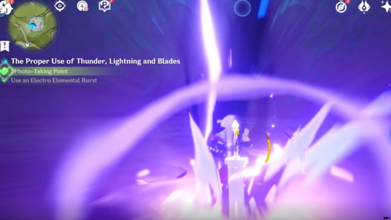 - エレクトロ キャラクターのエレメンタル バーストを使用して、すぐにショットを撮る カメラと。バースト アニメーションが終了するまで待たないでください。写真が失敗します。これは、雷電将軍やフィシュルのような、バーストの持続時間が長いキャラクターにも当てはまります。キャスト アニメーションの写真のみがカウントされます。