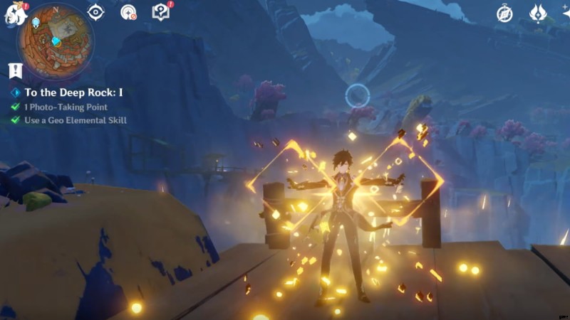 - 任意のジオ キャラクターに切り替えます エレメンタル スキルをアクティブにします . まだスキルをキャストしている間にすぐにショットを撃つ .スキルがキャストされた後に写真を撮った場合、ジオ コンストラクトなどの持続効果がある場合でも、写真はカウントされません。