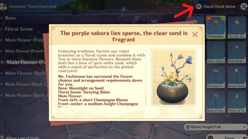 チャレンジを開始すると、使用できる花のテーマが提供されます。花の中庭の説明と画像で構成されています。 右上隅をクリックして参照できます 画面の。しばらくすると、花の正確な仕様が提供されます と書いてあるので、参考にするだけであっという間にアレンジが完成します。