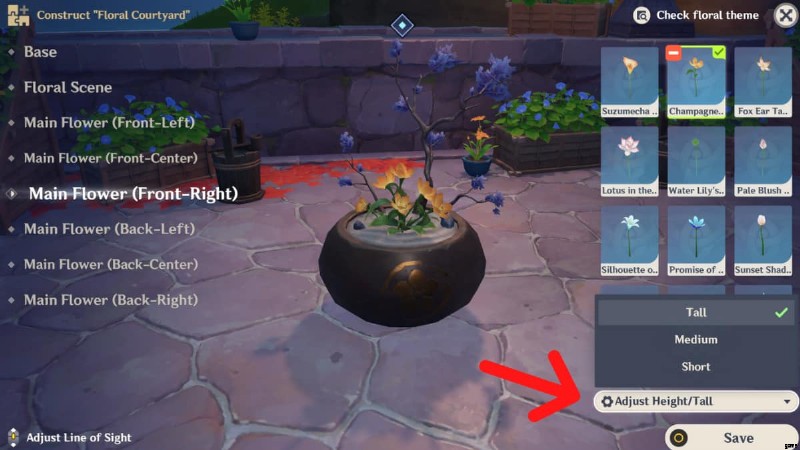 [高さ/高さの調整] ボタンをクリックして、花の高さを調整できます。 保存の上。フラワー コートヤードを完成させるには、伏染のフローラル テーマに記載されている正確な仕様を取得する必要があります。 [保存] をクリックします 後で続行するために作業を保存します。正しいフローラル コートヤードを構築した場合は、[保存] をクリックするとチャレンジが完了します。