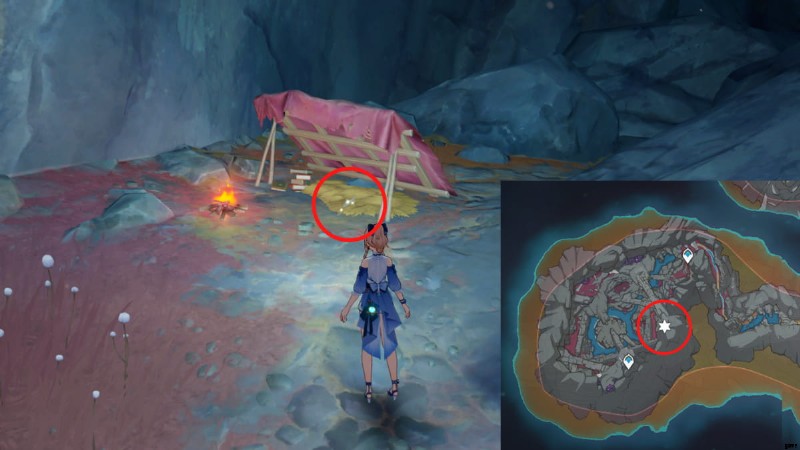 Valor's Afterglow ワールド クエストを完了したら、The Glowing Narrows の西にある上記の円で囲まれたエリアに向かいます。 地面に光るアイテムがある最近使用されたキャンプを見つけることができます .それを拾うと、知瓊の手紙が現れます。これにより、Valor's Afterglow と呼ばれる世界の驚異の実績を獲得できます .ベース キャンプに戻り、Jinw に手紙のことを知らせ、このシリーズを締めくくるのを忘れないでください。