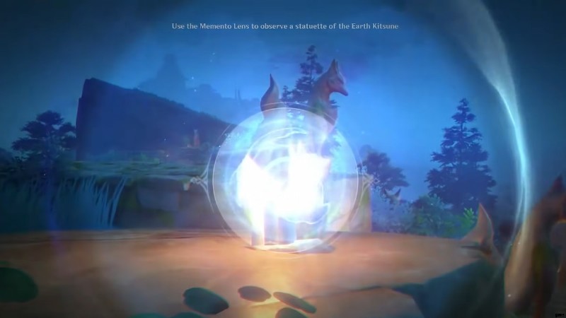 この後、大きなキツネの像と触れ合います 話しかけられた 2 番目の女性が立っていた場所。プレイヤーは3つの質問に答える必要があります 像によって正しく与えられます。これらの回答は、プレイヤーが Memento Lens で見たものに関連しています。