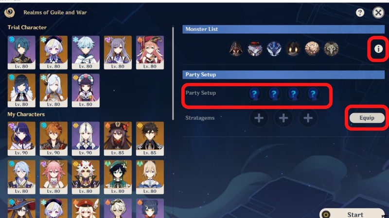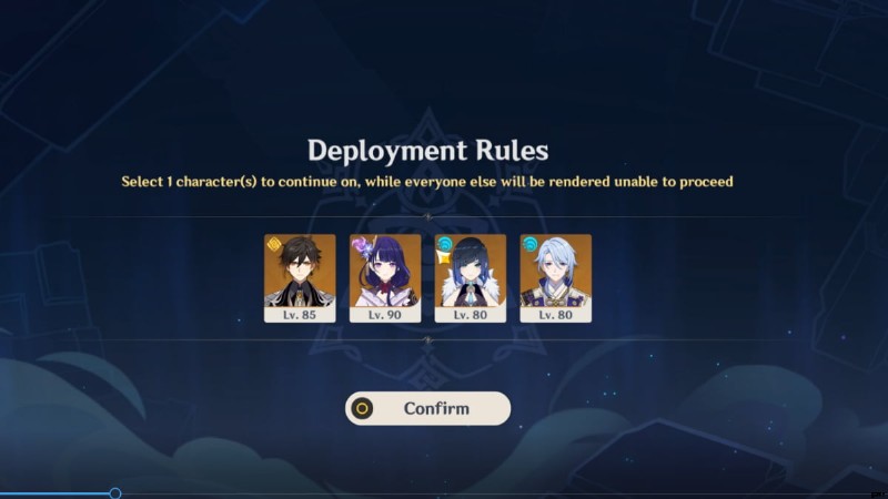 Realm に連れて行く 4 人のパーティーを選択できます。 Genshin Impact には、ダンジョンごとに異なる、バトルに配置できる 8 つの作成済みのトライアル キャラクターが用意されています。 各キャラクター 1つとして数えます 、トライアルセレクションと自分のロスターで同じキャラクターを持っていても。たとえば、お試しQiqiとあなたのQiqiは1文字としてカウントされます。ただし、レベル 1 の Qiqi またはトライアル レベル 80 の Qiqi を展開することを選択できます。